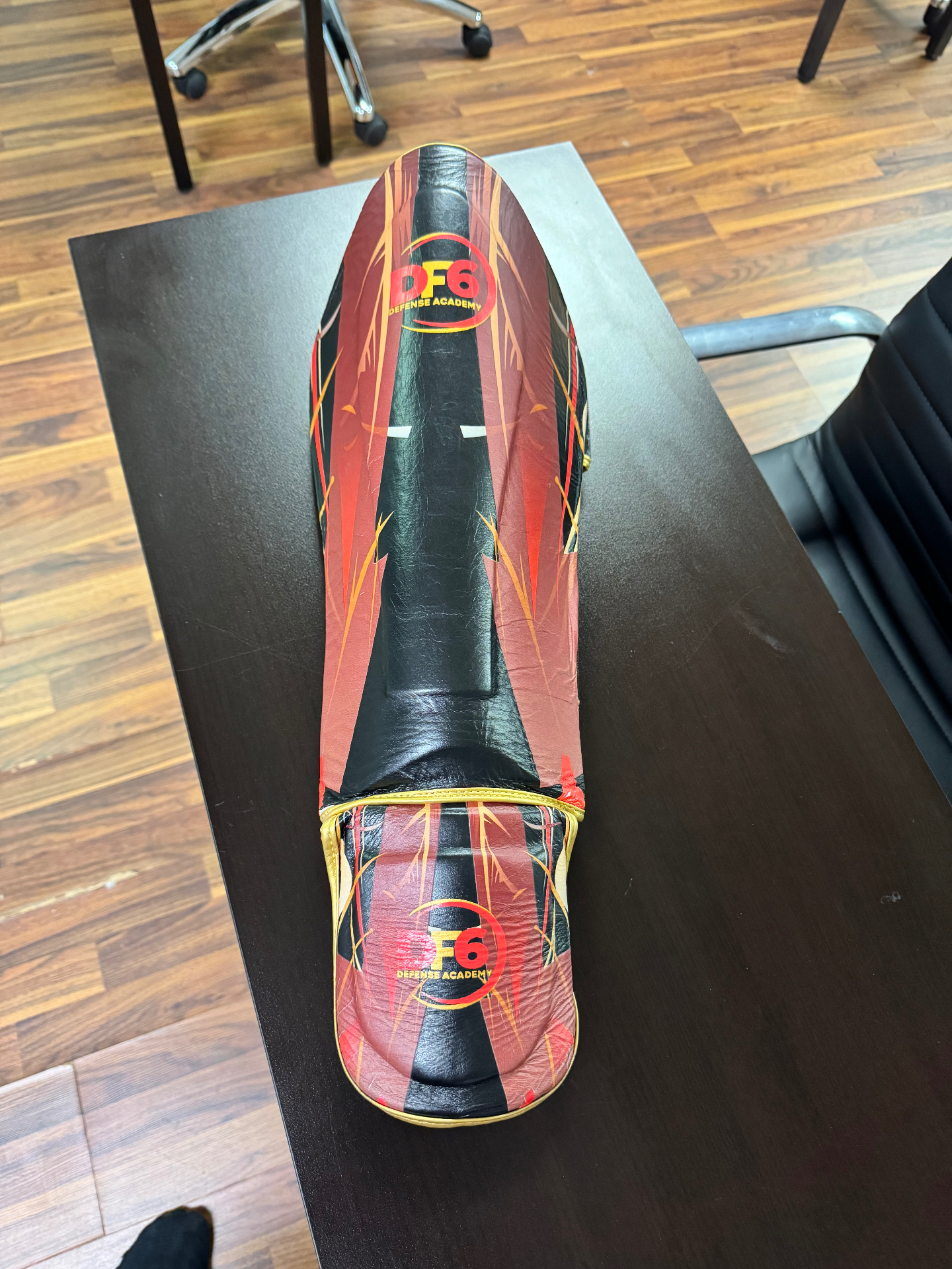 These high quality professional quality shinguards are handmade engineered leather and multi layered memory foam padding . Extra padding on foot , ankle & shin are for extra safety . 2 well positioned hook&loop velcro closures make sure these shinguards don’t slip around while training . Open Back for ventilation